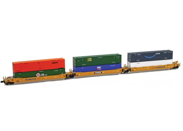 The cars are articulated and ride on modified AZL 90001 roller-bearing trucks. These trucks swing quite freely. A railing ramp is suggested for placing the cars on the track. A minimum of curve of 220mm and above is recommended.Each set will come with six containers. The 53' containers are the first time AZL has offered corrugated type containers in this length. The 40' containers are a re-release with new tooling as well. AZL plans to offer a mix of containers from discount stores, online stores, overnight delivery services, shipping companies, moving companies and railroads.