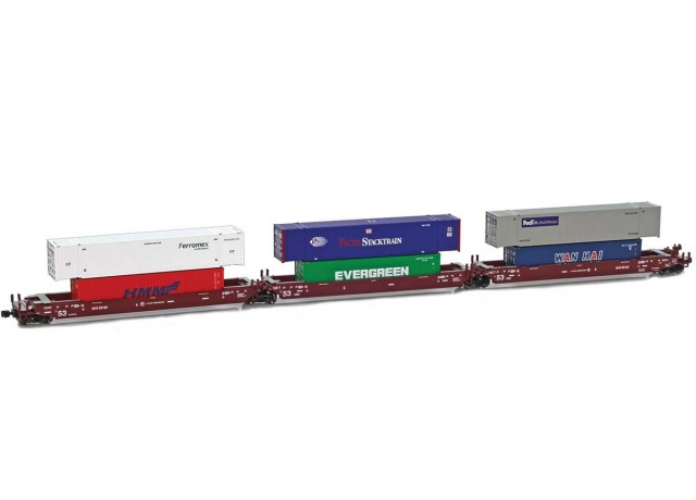 The cars are articulated and ride on modified AZL 90001 roller-bearing trucks. These trucks swing quite freely. A railing ramp is suggested for placing the cars on the track. A minimum of curve of 195mm and above is recommended.Each set will come with six containers. The 53' containers are the first time AZL has offered corrugated type containers in this length. The 40' containers are a re-release with new tooling as well. AZL plans to offer a mix of containers from discount stores, online stores, overnight delivery services, shipping companies, moving companies and railroads.