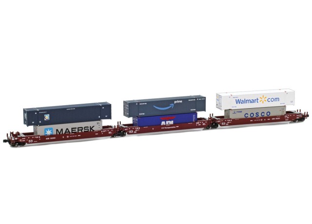 The cars are articulated and ride on modified AZL 90001 roller-bearing trucks. These trucks swing quite freely. A railing ramp is suggested for placing the cars on the track. A minimum of curve of 220mm and above is recommended.Each set will come with six containers. The 53' containers are the first time AZL has offered corrugated type containers in this length. The 40' containers are a re-release with new tooling as well. AZL plans to offer a mix of containers from discount stores, online stores, overnight delivery services, shipping companies, moving companies and railroads.