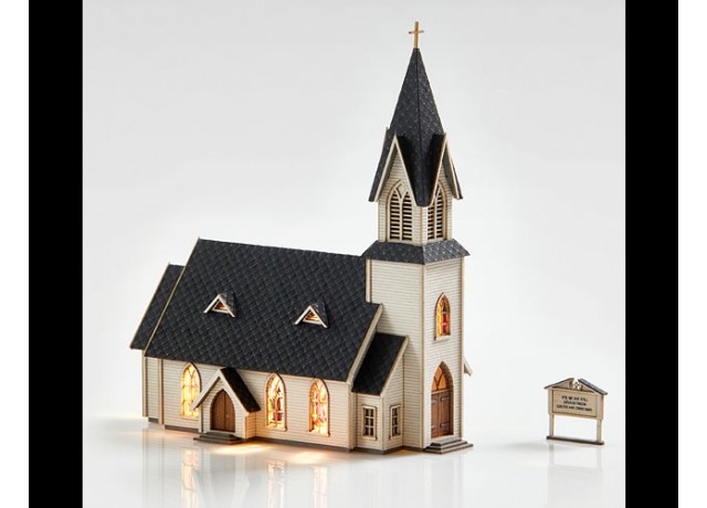 The church is white with steeple. There is even a bell in the tower! Lighting is almost a must with this kit. ArchiStories has included stained glass windows that when lit, really show the details. We now offer a special 2-pack of warm white stick-on LEDs from Raildig that make lighting quick and easy.