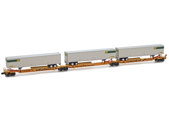 The cars are metal with both etched metal and plastic add-on details. The cars are articulated and ride on modified AZL 90001 roller-bearing trucks. They are lettered for TTAX (old logo).