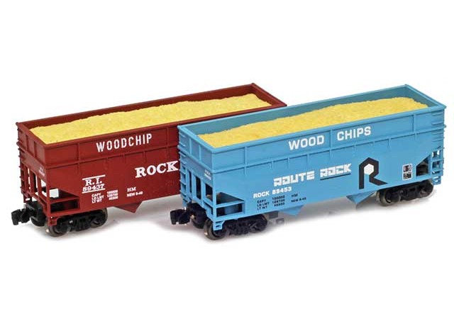 A new COLLECTOR 2-pk of Woodchip Hoppers! When helpful and profitable uses for woodchips were realized after mid-century and they transcended being "trash," there was a scramble to figure out a way to transport them via the railroads. Old hopper cars, both ribbed and offset were pressed into service. The addition of "extended tops" made the transport of the lighter-than-coal chip loads effective and productive. All manner of tops were conceived, from wood planking and braced ply-boards to welded steel sheeting and scrap siding. These Rock Island woodchip hoppers represent refurbished offset-side hoppers (one a repaint) with a welded steel-side extension.
