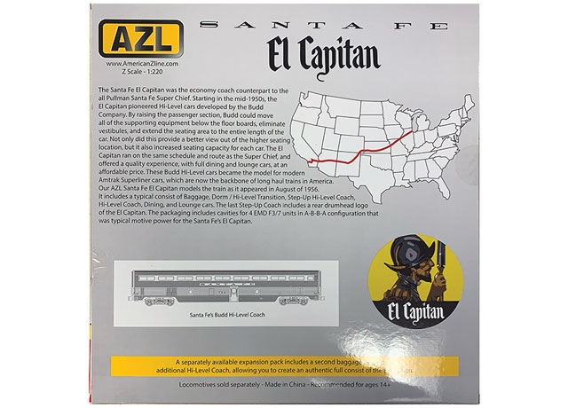 The Santa Fe El Capitan is here! These iconic trains are now available in Z scale! AZL has released three El Capitan eleven car sets. In addition to the 11-car sets is a bonus 2-car set. One add-on set is required to model the full 13-car set.