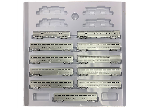 Our Santa Fe El Capitan models the train as it appeared in August of 1956. It includes a typical consists of Baggage, Dorm / Hi-Level Transition, Step-Up Hi-Level Coach, Hi-Level Coach, Dining and Lounge cars. The last Step-Up Coach includes a rear drumhead logo of the El Capitan. The packaging includes cavities for four EMD F3/7 units in an A-B-B-A configuration that was typical motive power for the Santa Fe’s El Capitan.